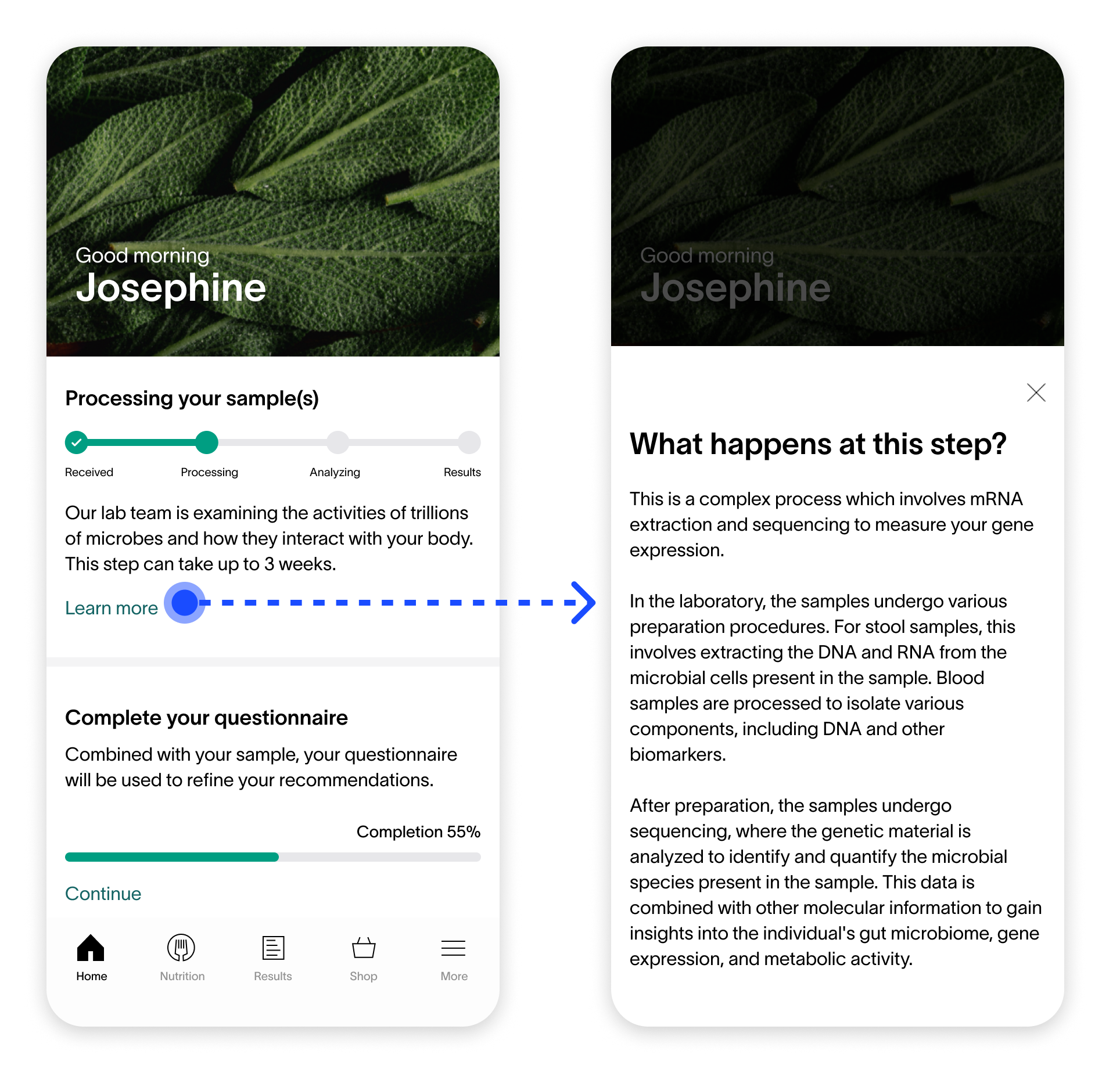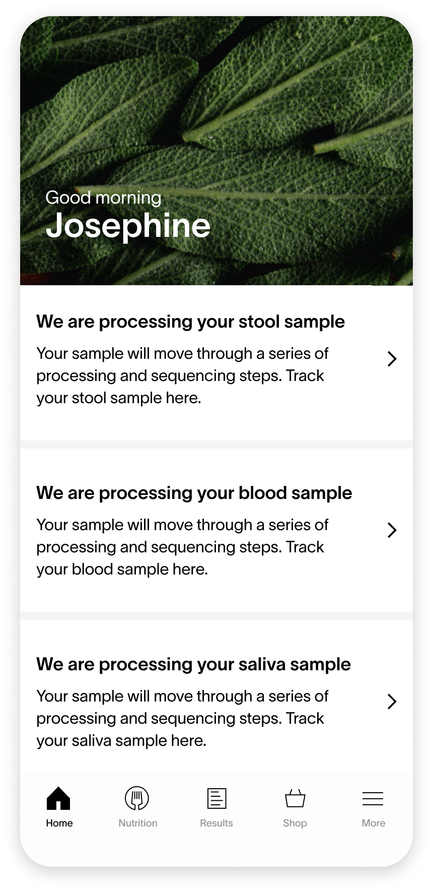 Combining the status of all samples reduces information overload. Customers only need to see one card component regarding the status of their health test results.
