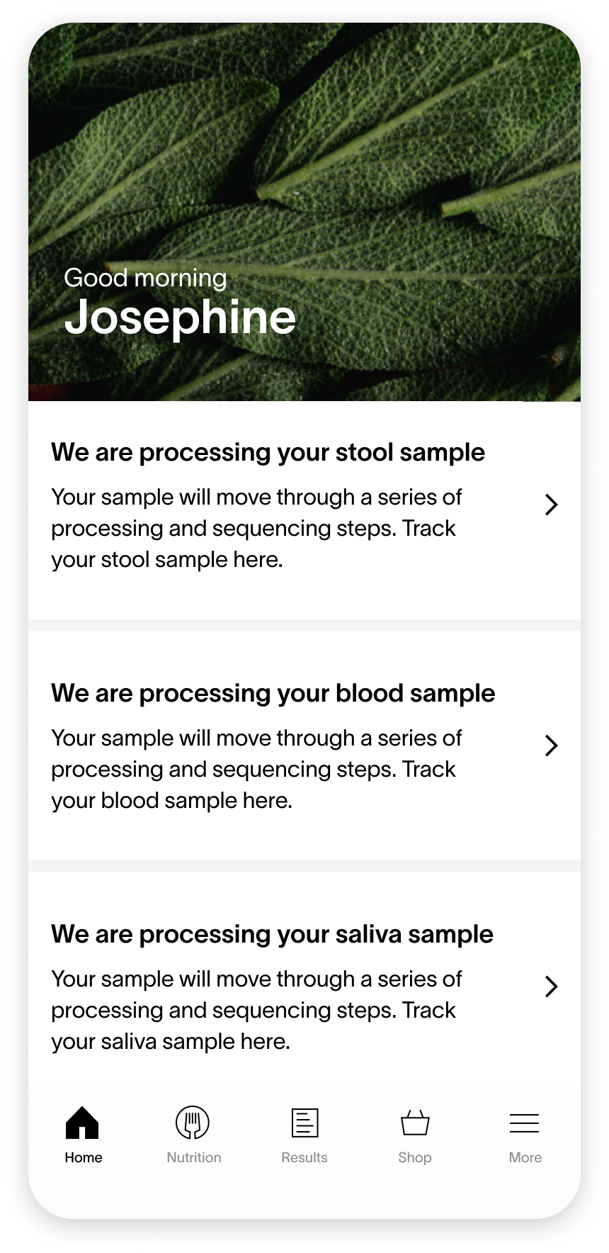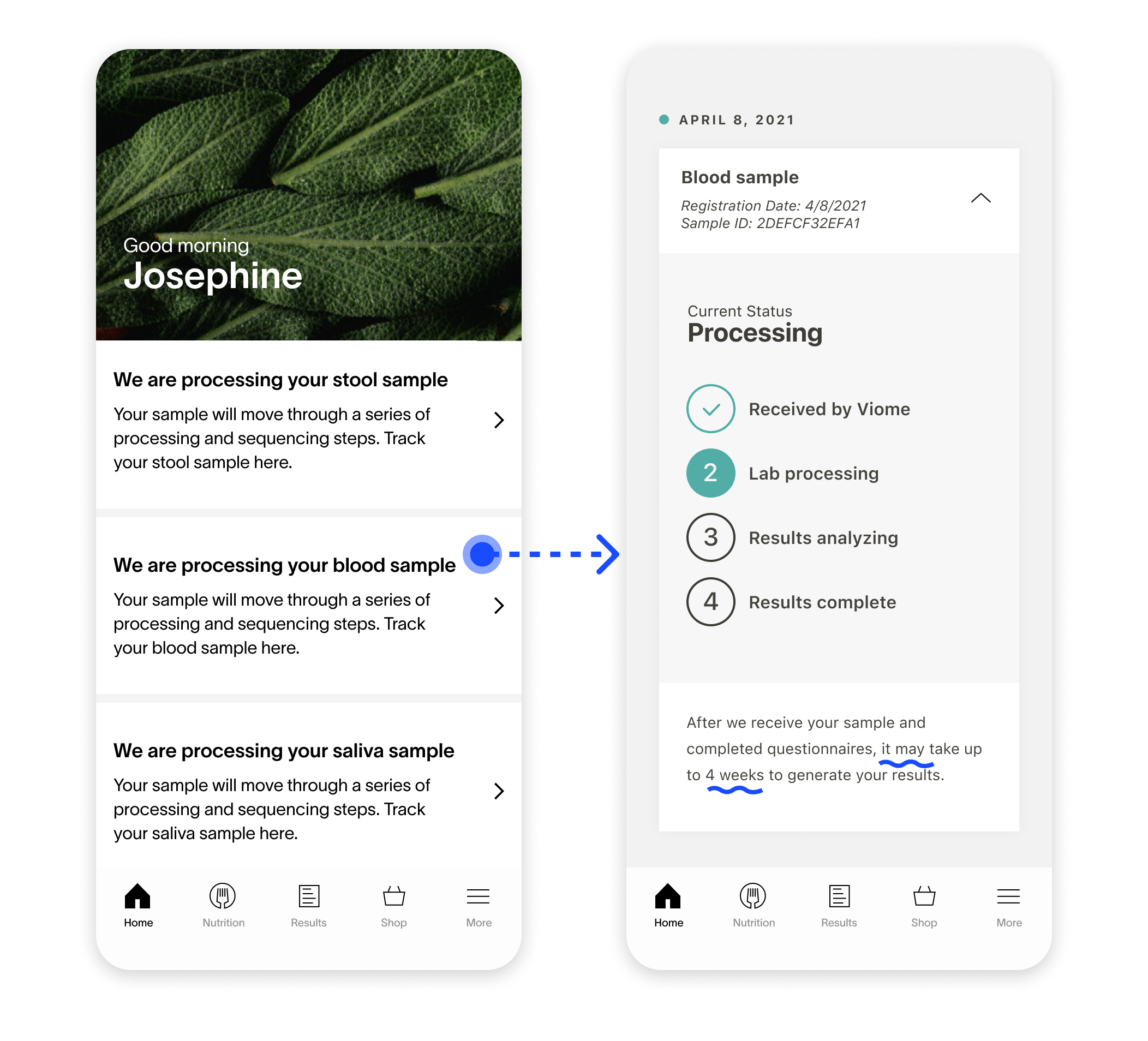 Combining the status of all samples reduces information overload. Customers only need to see one card component regarding the status of their health test results.